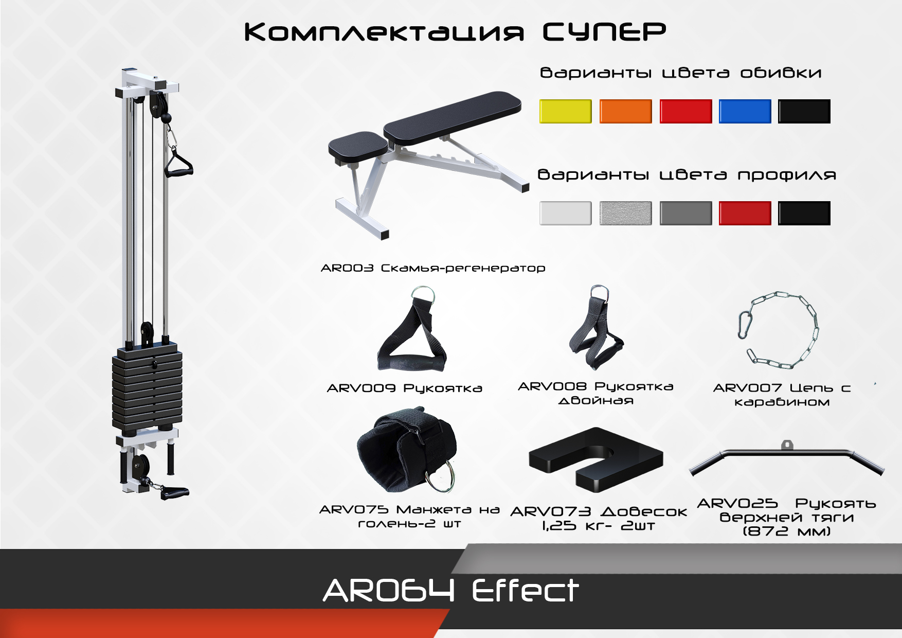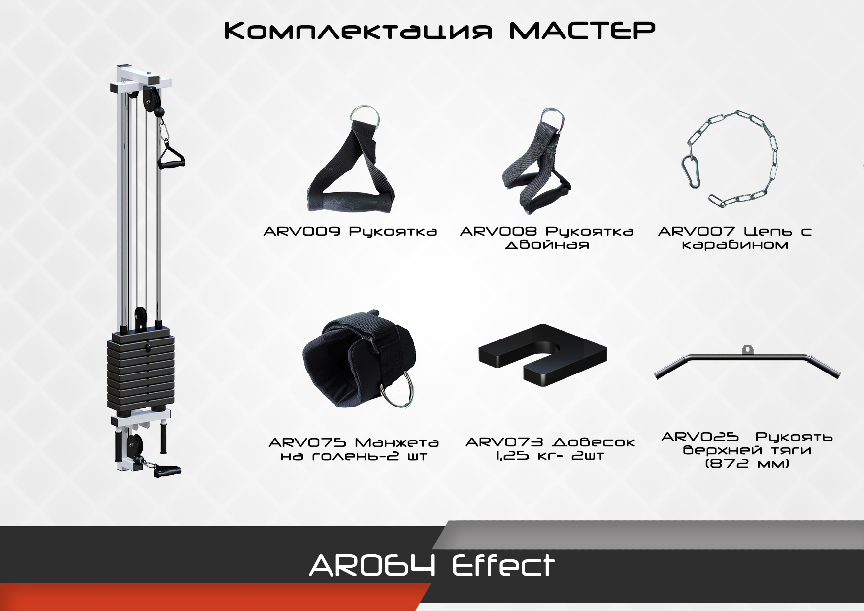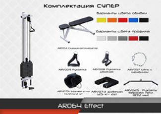 Тренажер Effect предназначен для выполнения широкого ряда упражнений в домашних условиях: развитие мышц пресса, груди, всех мышц рук и ног, а также реабилитационных упражнений таких заболеваний как остеохондроз, боли в шее, суставах и т.д.